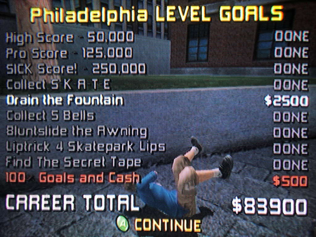 No upgrades: Additionally, I’d continue to collect as much of the hidden cash icons strewn about the levels as possible but I would commit to spending nothing. Not on boards. Not on tricks. And certainly not on stat upgrades. In this playthrough, the Birdman would never learn to fly. Granted, even without upgrading any of his abilities, Tony’s default vert stats aren’t terrible. His respectable default air and spin abilities still made it easy to pull off 720 grabs on a whim in a half pipe, so that much didn’t change. However, his poor default street skating skills — particularly ollies and rail/lip balancing (some the first things I’d normally upgrade) — were very noticeable deficiencies.
