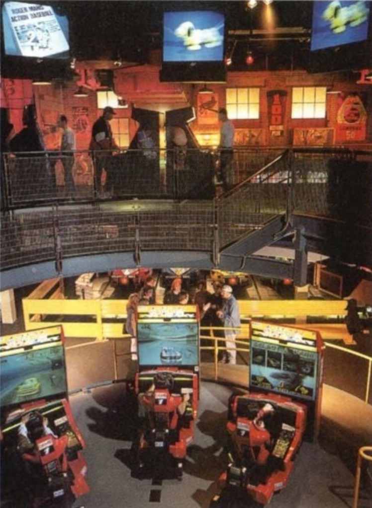 Combining the ambitions of its ownership partners — with creative input from Steven Spielberg — GameWorks was a potent cocktail of innovation, experimentation, and spectacle. They even hired a former Disney Imagineer to help develop and curate proprietary experiences steeped in then-cutting-edge technologies. These included massive wall screens with hydraulic lifts (dubbed “Vertical Reality”), a network of player-enveloping projection screens (“Game Arc”), and a motion-controlled flail room (“Virtual Arena”). Through these attractions, GameWorks sought to engross players in a future of gaming outside their homes.