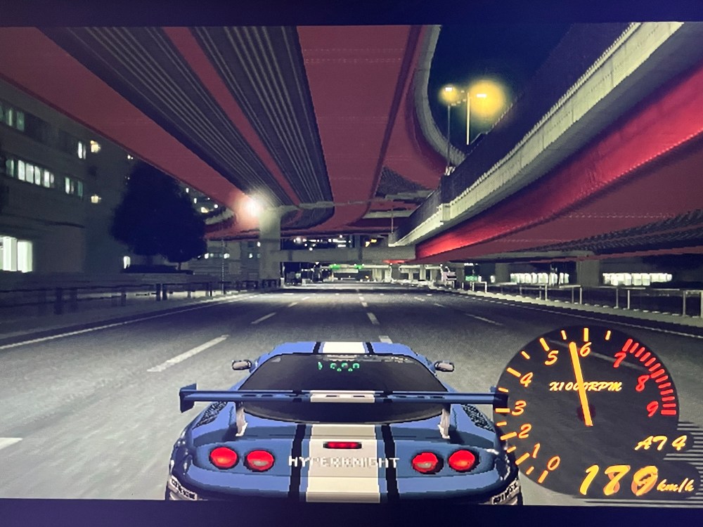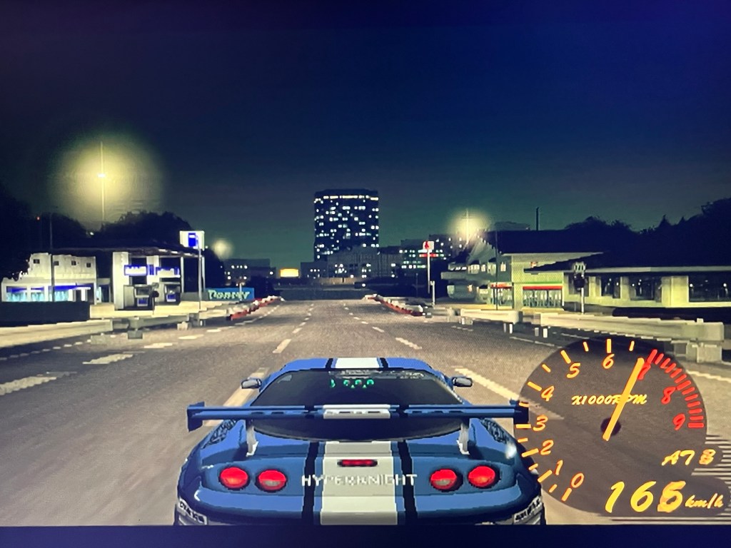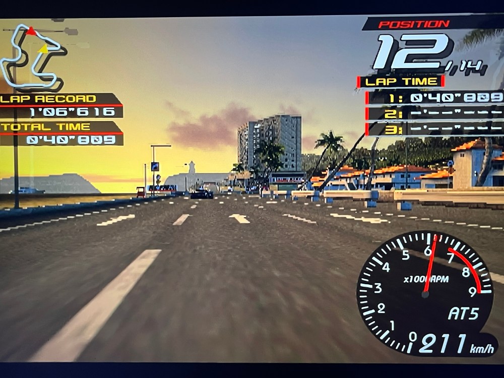 Although RRV’s Ridge City fails to ignite my imagination as a habitable space, I adore cruising its sleek streets. And it really is a gorgeous setting, aliasing be damned. In Namco’s pivot to a more grounded aesthetic, the city appears both striking and serene. At night, its highways bathe in an incandescent glow. The cars sheen and flicker under street lamps and — with their low suspensions — they ignite blooms of sparks at the faintest hint of an incline to scrape against. Meanwhile, the coast is stunning in dusk’s tinge, even if the seaside redevelopment banishes all but the wealthiest holiday goers from taking it in.