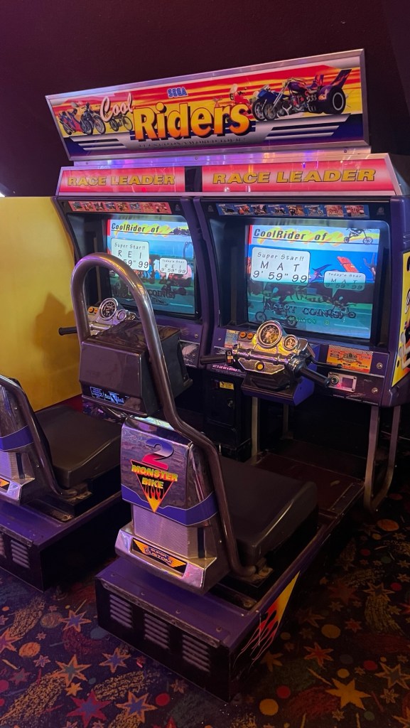 Of course the odd Sega cockpit cab is a classic fixture of any decent arcade, and that’s also true here. I was overjoyed to find OutRun 2 SP and Cool Riders, games I hadn’t played in days and decades, respectively. Both have been neglected for years. SP’s steering column is loose and wobbly, and its gear shift paddles off kilter. Its projection screen is emblazoned with decades of burn in. Meanwhile, Cool Riders’ handlebars feel mostly stable but its bikes constantly veer to the left. Both are still enjoyable to play, if only just.